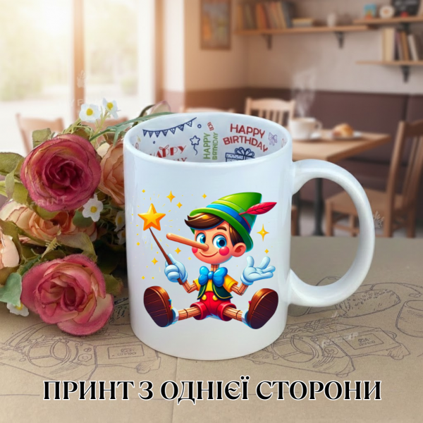 Купити Кружка Піннокіо Pinocchio з принтом керамічна чашка з написом всередині «Happy Birthday» 330 мл за ціною 295 грн. від виробника